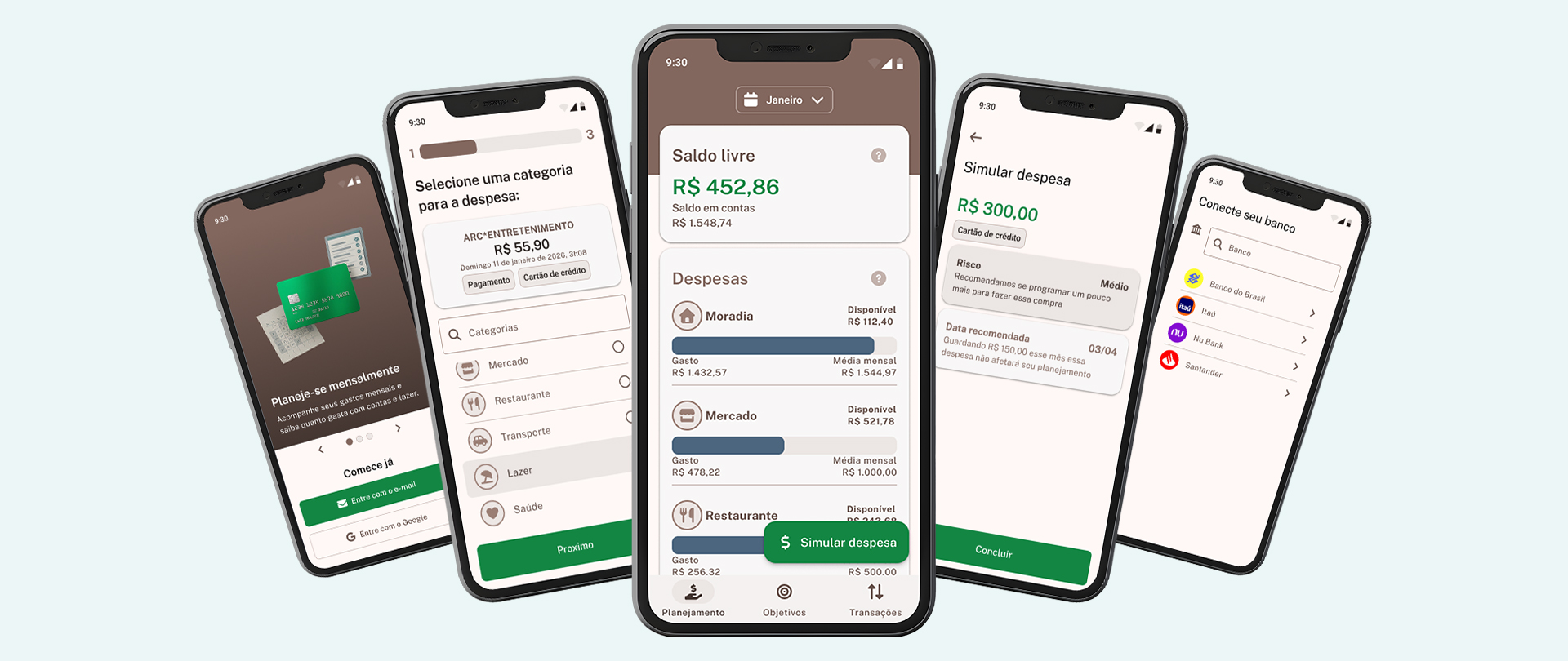 Planejamento mensal focado em categorização automática de gastos e simulação de compras.